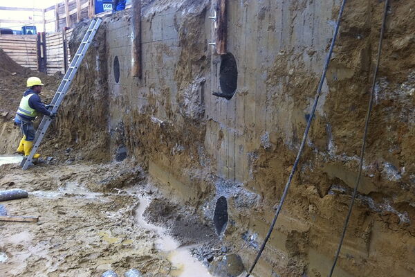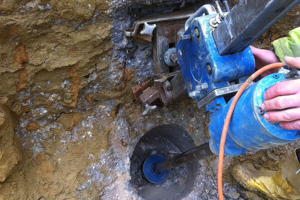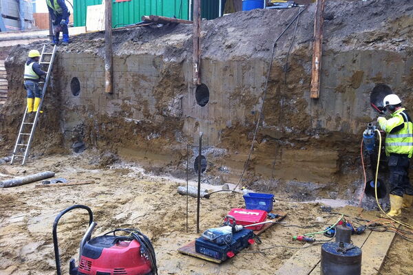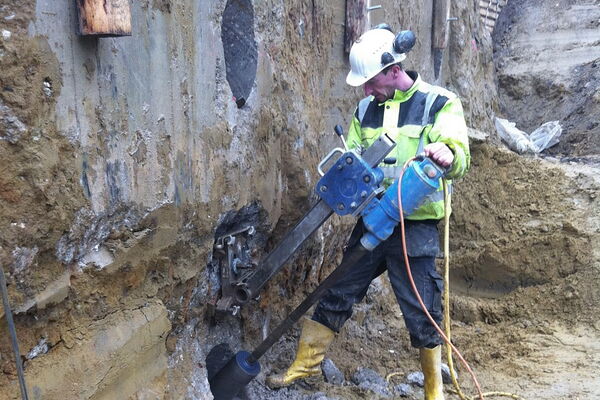In der Duisburger Innenstadt ist ein Bunker abgerissen worden. An dieser Stelle wurde ein neues Geschäftshaus errichtet. Zunächst wurde ein Aufleger mit einem Durchmesser von 350 mm und einer Tiefe von 20 cm in einem Neigungswinkel von 45° hergestellt. Anschließend erfolgte die Bohrung mit einem Durchmesser von 160 mm und einer Tiefe von ca. 3 m, ebenfalls im 45°-Winkel.