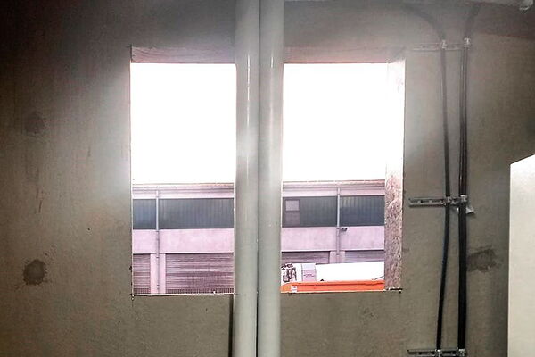 Präzise Fensteröffnung an der Feuerwache Moers, durchgeführt mit spezialisierten Sägeverfahren. Rohrleitungen wurden dabei nicht beschädigt.